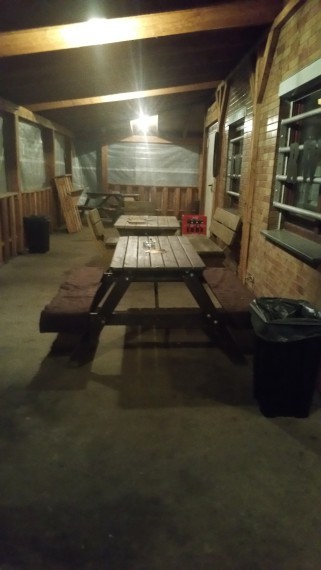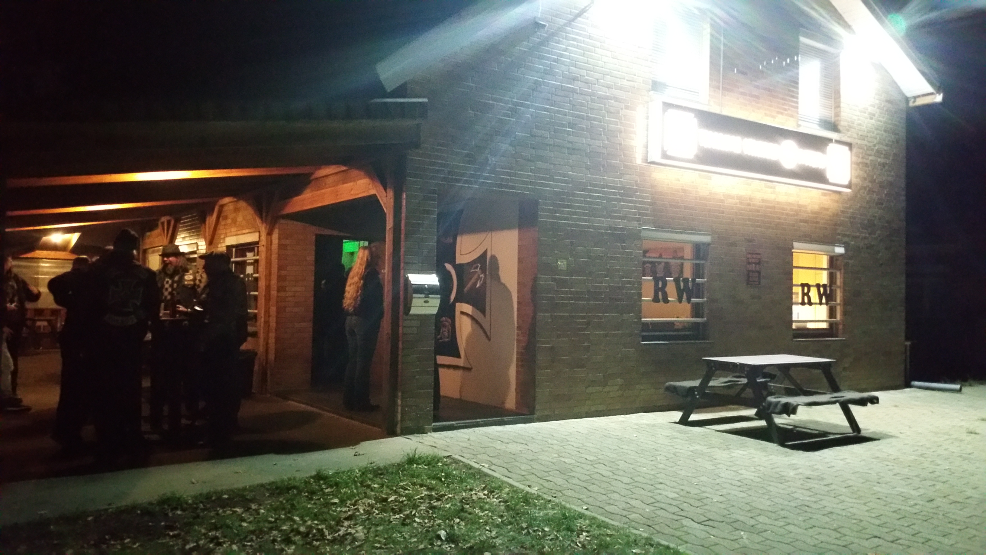 Der Empfang war schon mal genial. Vorne am Tor loderten oberhalb des Colors die Flammen und als ich meine Kiste abstellte, gab es zwei nette Stichflammen zur Begrüßung. Das Klubhaus liegt am Waldrand und wird umringt von einem fetten Gelände. Damit ohne Ende Platz für reichlich Böcke, eine große Lagerfeuerstelle und was man sonst noch so braucht, um im Außenbereich eine mega Sause zu feiern.
