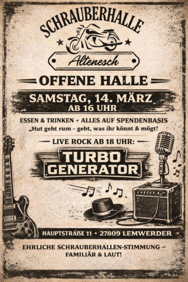 Am kommenden Samstag öffnet die Schrauberhalle in Altenesch erneut seine Türen und das Higlight soll ganz sicher das Konzert von der Band Turbogenerator werden, die ab 18 Uhr die Halle mal so richtig berocken wird, so jedenfalls meine Erwartungshaltung. Ich habe von der Kombo noch nie etwas gehört, was mich persé bereits neugierig macht, da ich ja für das Rock Pub Widside sowie das Onlinemagazin ohnehin stets auf der Suche nach frischen Musikacts bin.