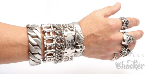 A ganzer Haufa, wie man bei uns im Ländle so schön sagt, also viele! Heute sind genau 590 Artikel, ohne unterschiedliche Längen und Größen dazuzurechnen, über unseren Onlineshop verfügbar. Aber die Zahl ist stetig steigend. Ich denke, bis Weihnachten werden es sicherlich über 600 Artikel sein. Darunter ist eigentlich alles, was Bikerherzen höher schlagen lässt. Von expliziten Bikermotiven wie Motorräder, Motorböcke, Reifen über Tiermotive wie Wölfe, Löwen oder Adler, bis hin zu Motiven für Outlaws und Rebels wie das Onepercenter-Zeichen, Schlagringe und Totenköpfe. Aber wir haben zum Beispiel auch eine große Auswahl an klassischen Herrenarmbändern aus Leder oder Edelstahl, falls es mal etwas schlichter sein soll. Ich denke für jeden, der auf der Suche nach einem coolen Männergeschenk ist, lohnt es sich beim schmuck-checker.de vorbei zu schauen.