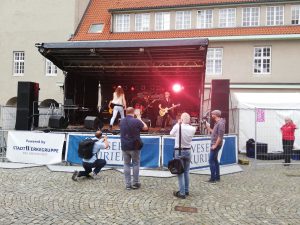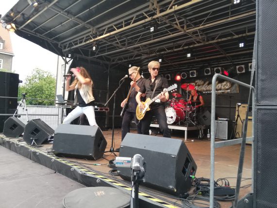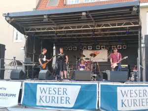Als die hoch versierten und regional bekannten Rockalots mit Gesangs-Guru Sam die Bühne am Bismarckplatz betraten, hatte ich zunächst das Gefühl, dass sich das Publikum ausgedünnt hatte. Wie jetzt, sitzen die Delmenhorster tatsächlich trotz des super Wetters um 20.00 Uhr vor dem TV-Gerät, statt den prächtigen Sonnenschein zu nutzen, um wenigstens einen Abstecher zum Stadtfest zu machen? Gottlob änderte sich das im Laufe des Konzertes.