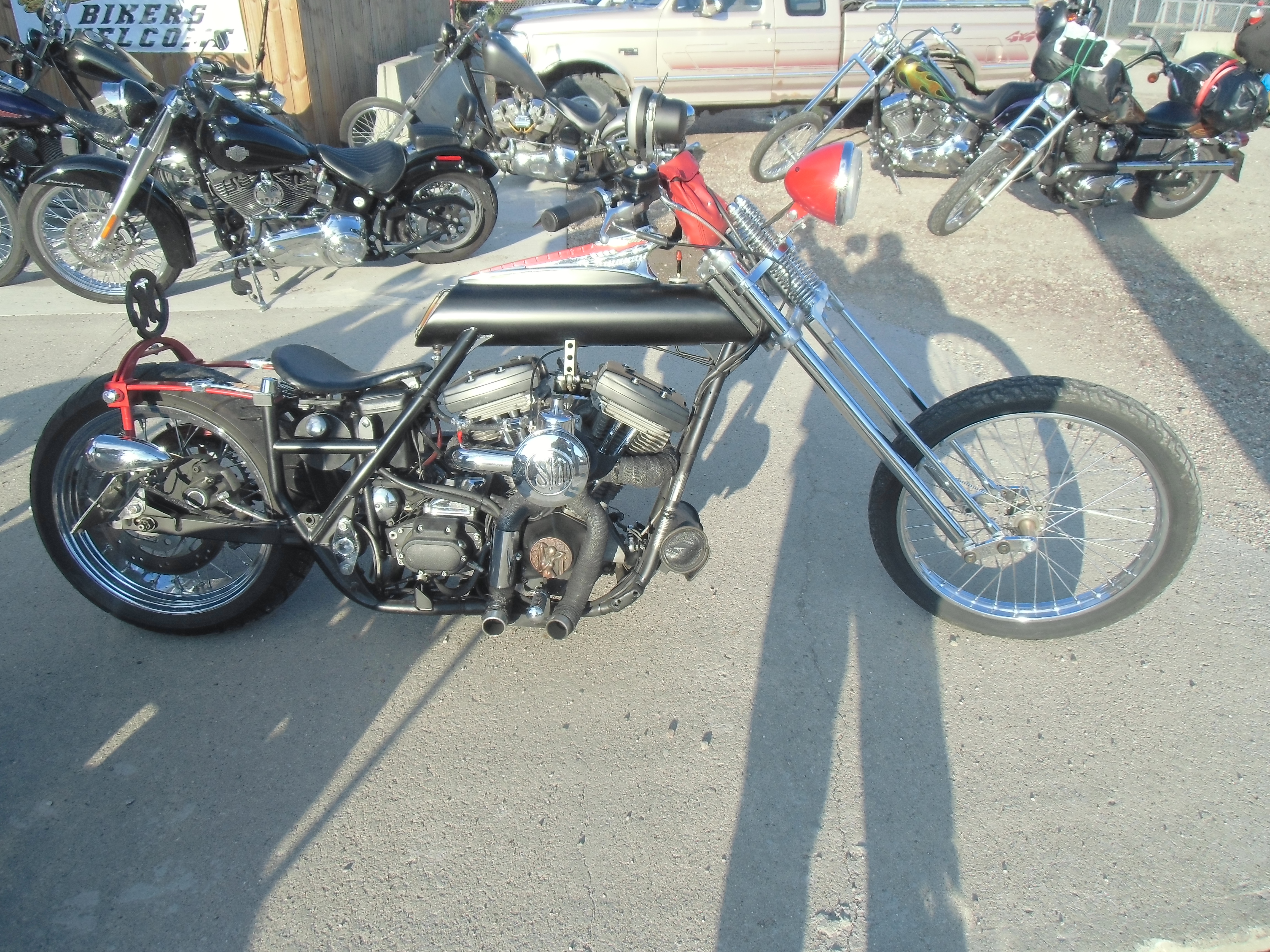 Am anderen Morgen konnte ich sogar noch die Chopperschmiede von Moose1%er besichtigen. Mit einem nur ganz großen Männern eigenen Selbstverständniss konnte er mir zu fast jeder Maschine eine kleine Geschichte erzählen. Die etlichen Rahmen und zum Mogup aufgebauten Schätze standen in geordnetem Chaos in der kleinen Halle, mindestens zwei Ersatzteillager, mir kamen fast die Tränen,—ach könnten wir nur in Deutschland…So what the Fuck is TÜV? ihr wisst was ich meine!