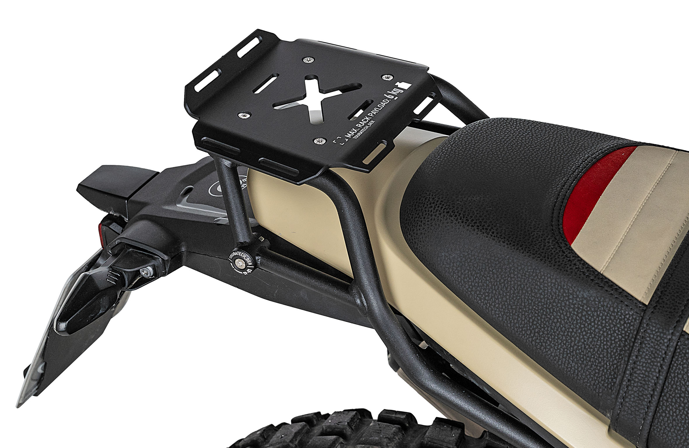 Wenn die R 12 G/S ihre exzellenten Touring-Eigenschaften ausspielen soll, ist ein durchdachtes Gepäcksystem gefragt. Die Touratech Gepäckbrücke bietet dank ihrer mit zahlreichen Riemenschlitzen ausgestatteten Gepäckplatte nicht nur Platz für die sichere Verzurrung eines Rack Packs. Mit ihrer aus pulverbeschichtetem Edelstahlrohr gefertigten Grundkonstruktion verstärkt sie zudem das Rahmenheck und bildet die Basis für die Montage eines Kofferträgers, an dem sich die Softkoffer der Reihen Endurance, Travel und Extreme Edition pistenfest montieren lassen.