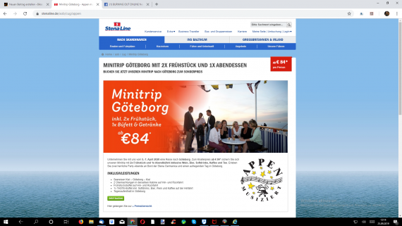 Unternehmen Sie mit uns vom 5.-7. April 2020 eine Reise nach Göteborg. Zum Knallerpreis ab € 84* sichern Sie sich unseren Minitrip mit 2x Frühstück und 1x Abendbüfett inklusive Wein, Bier, Softdrinks, Kaffee und Tee. Erleben Sie zwei herrliche Party-Abende an Bord der Stena Germanica und einen aufregenden Tag in Göteborg.