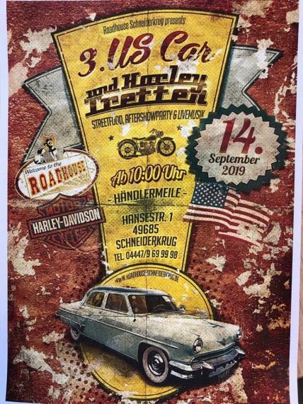 Am kommenden Samstag findet am Roadhouse Schneiderkrug in Emstek das 3. US Car und Biketreffen statt. Das nehme ich mir heute mal explizit vor, weil es für die Fans von amerikanischen Fahrzeugen auf zwei und vier Rädern sicherlich interessant sein dürfte mehr darüber zu erfahren.