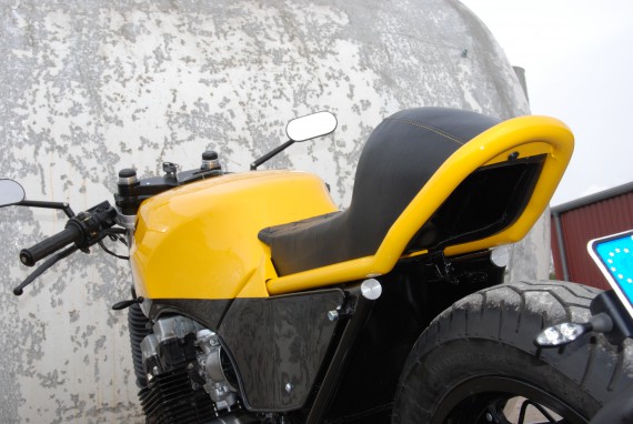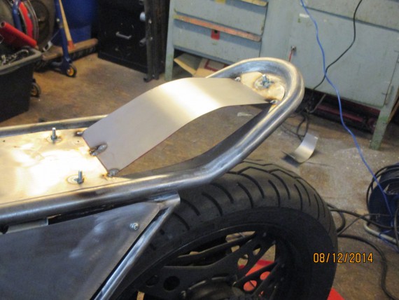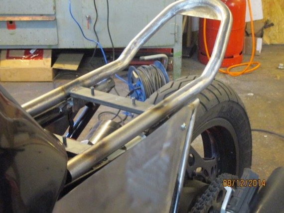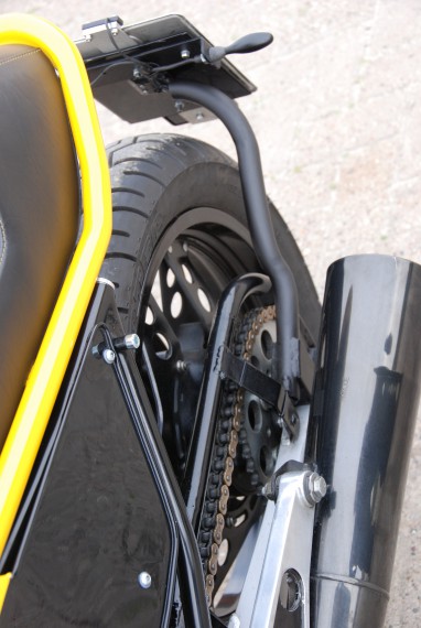 3.Das Heckteil: Ein Eigenbau! Das um die Sitzbank laufende 1″-Stahlrohr wurdfe gebogen und mit Aufnahmen für die Sitzbank versehen.Die Grundplatte für den Sitz hat Volker aus Stahlblech angefertigt. Der Sattel wurde vom Polsterer bezogen. Die Seitenteile unter der Sitzbank sind aus Stahlblech angefertigt und mit 3mm dicken Rundstahl gekedert, damit es nicht so plump wirkt.