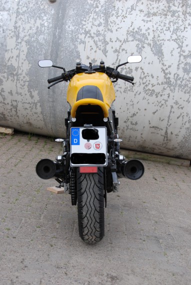 4.Kennzeichenhalter: Ein Eigenbau aus 1″-Stahlrohr und eine Kennzeichenhalteplatte aus Alu. Die Kabelführung für Licht und Blinker laufen durch das Rohr.