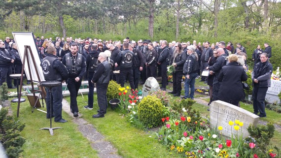 Mit dem Ende der Andacht verewigten sich die Trauergäste fast ausnahmslos mit ihrer Unterschrift auf dem Sarg, der nachfolgend zur Beerdigung auf den Friedhof Rudow verbracht wurde. Ein Motorrad-Korso begleitete Steini auf diesem letzten Weg dorthin. Vorweg die Wild Vikings, dahinter die Borns. Die Berliner Polizei stellte mit ihren Kradmeldern die Roadblocker. Natürlich fehlten die sogenannten Szene-kundigen Beamten nicht.