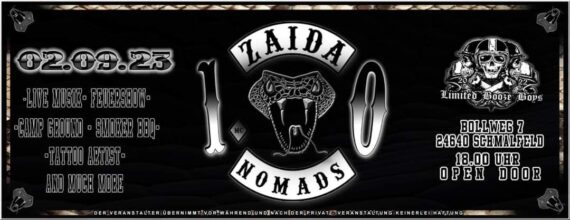 „Es ist soweit, 10 Jahre gibt es bereits das Nomads-Chapter des MC ZAIDA Germany. Das ist für uns ein Grund mit Euch zu einen  drauf zu machen. Am 02.09.2023 feiern wir daher bei unseren Brüdern am See ( Bollweg 7, Schmalfeld ) unser 10th Anniversary. Wir haben nicht nur eine Location die ihres Gleichen sucht , sondern auch viele weitere fette Sachen für euch am Start!