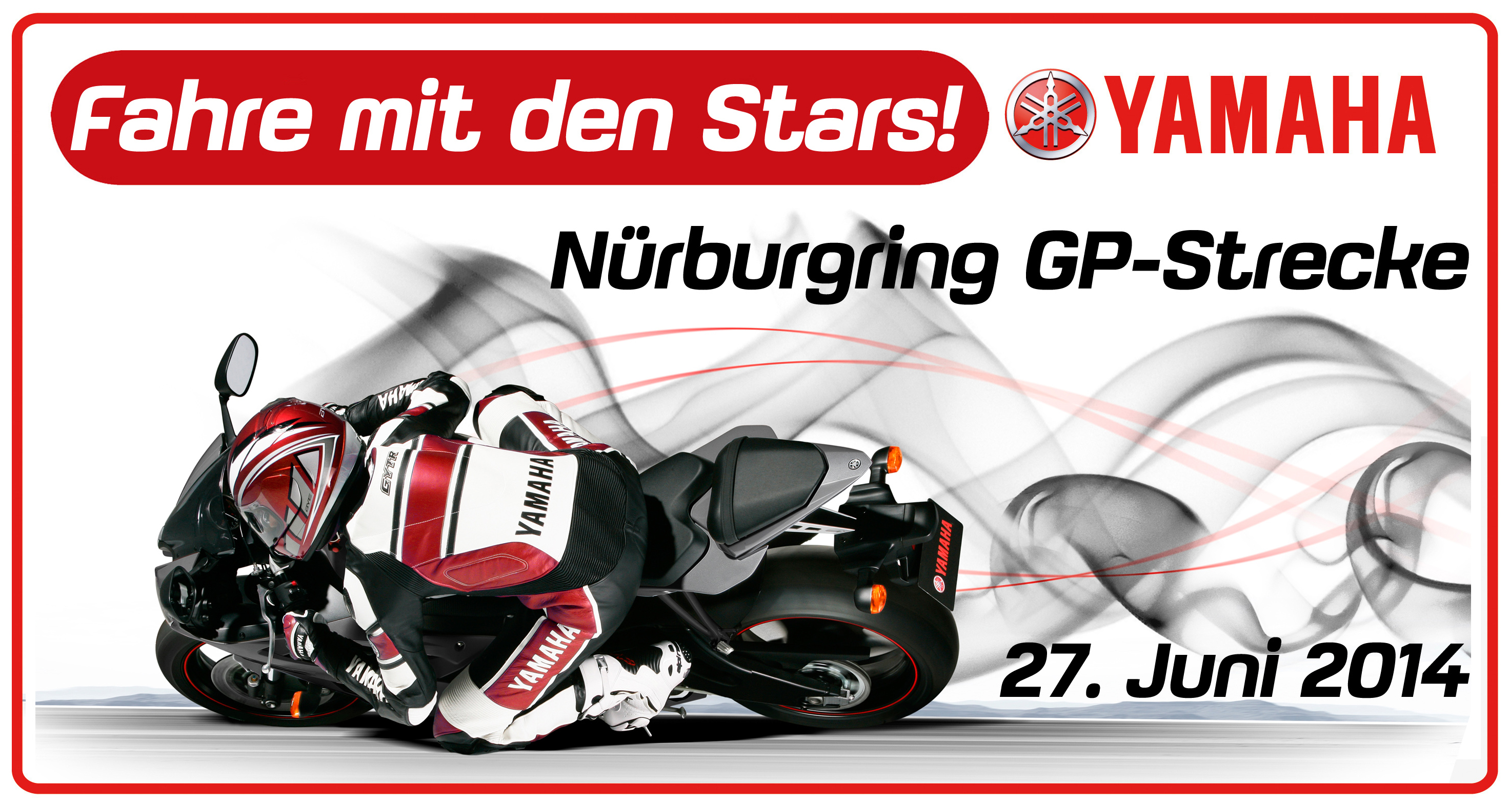 Yamaha bietet 50 ausgesuchten Yamaha-Fahrern die Möglichkeit, als Gast beim Superbike-IDM-Lauf dabei zu sei. Zum Programm gehört am Freitag, den 27.06.2014 neben dem Besuch beim Yamaha Motor Deutschland Superbike-Team, auch die Besichtigung der Box des Teams und ein Treffen mit den Fahrern Matej Smrz und Luca Hansen. Das ganz besondere Highlight sind dann gegen 17°° Uhr ein paar Runden auf dem eigenen Motorrad unter Anleitung der beiden IDM-Stars auf der Nürburgring-GP-Strecke. Außerdem sind die Teilnehmer Gäste des Superbike-Caterings. Beginn der Veranstaltung ist 17°° Uhr, das Ende ca. 21°° Uhr. Wer mag, kann am Samstag und Sonntag noch die spannenden Trainingsläufe und Rennen zur IDM-Superbike Meisterschaft und zum Yamaha-R6-Dunlop-Cup anschauen. Das Eintrittsticket dazu gehört ebenfalls zum Event-Paket. Und dann gibt es am Rennsonntag noch etwas für ganz Mutige: Unter allen 50 Teilnehmern wird eine Fahrt mit dem Renntaxi, einer speziell präparierten Doppelsitzer-R1 verlost, die von einem der Superbike-Fahrer pilotiert wird.